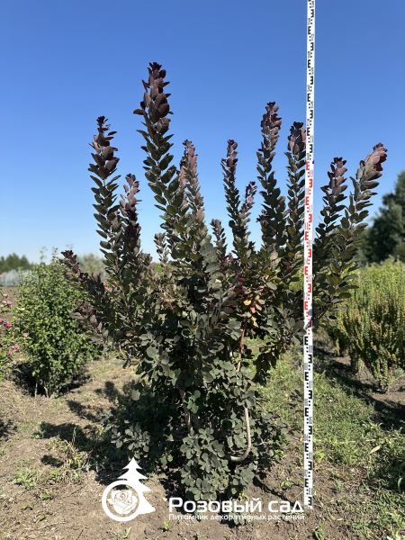 Эффектный крупный кустарник с раскидистой кроной и прямостоячими ветвями. Листья округлой формы, матовые, пурпурного цвета. Соплодия розовые похожие на пух. Предпочитает плодородные почвы с высоким содержанием кальция в почве. Используется для создания ярких контрастных групп, как цветовой акцент в саду.