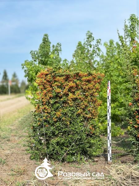 Полувечнозеленый кустарник с раскидистой формой кроны. Ветви прямостоячие, колючие. Листья темно-зеленого цвета, глянцевые. Цветки белые, собраны в зонтичные соцветия (май). Плоды ярко-красные долго сохраняются на растении. Не требователен к почвенным условиям. Используется в группах, одиночно, а так же как шпалерное растение.